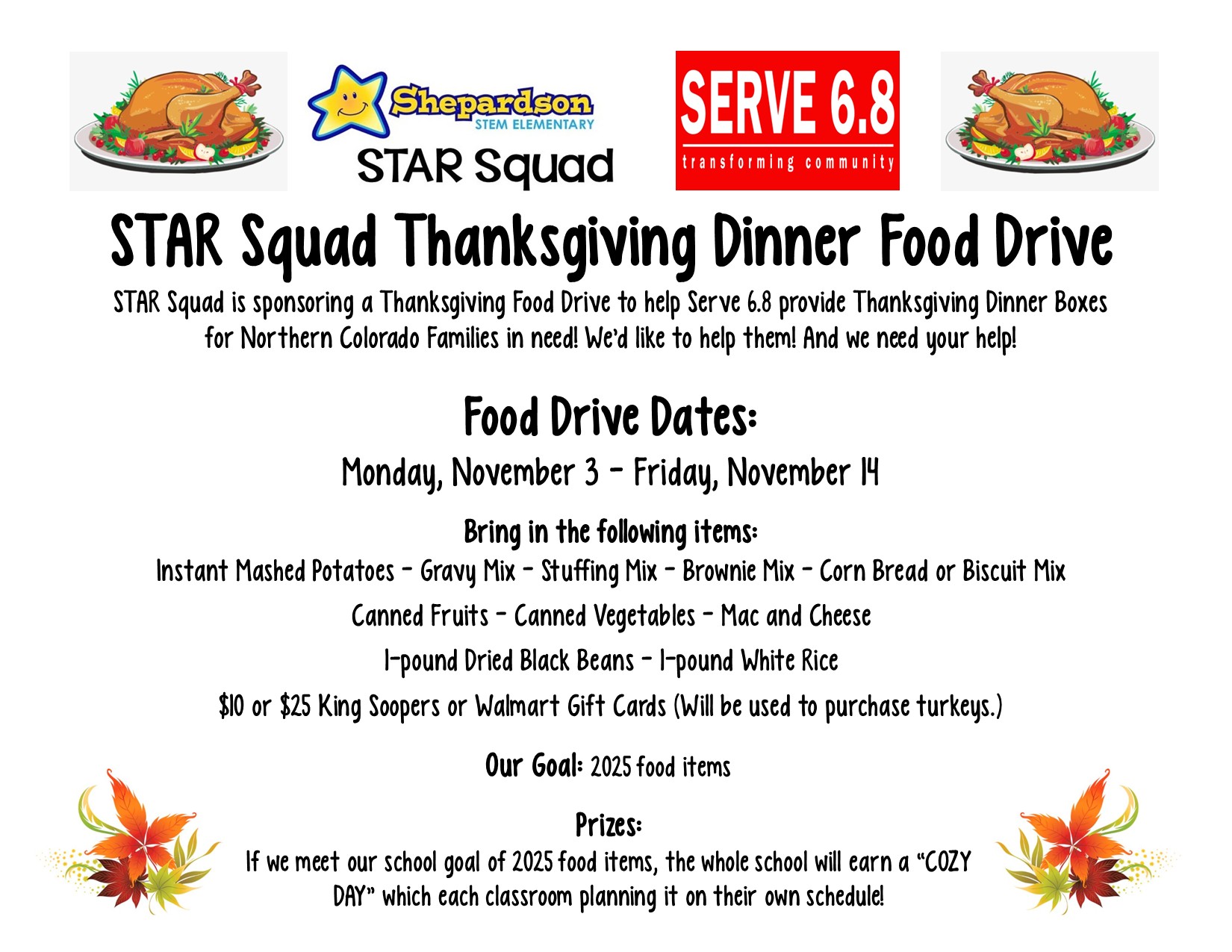 Drive ENDS on Friday, November 14, 2025. Please bring food item donations to school by FRIDAY! Thanks for supporting the STAR Squad Thanksgiving Food Drive!
